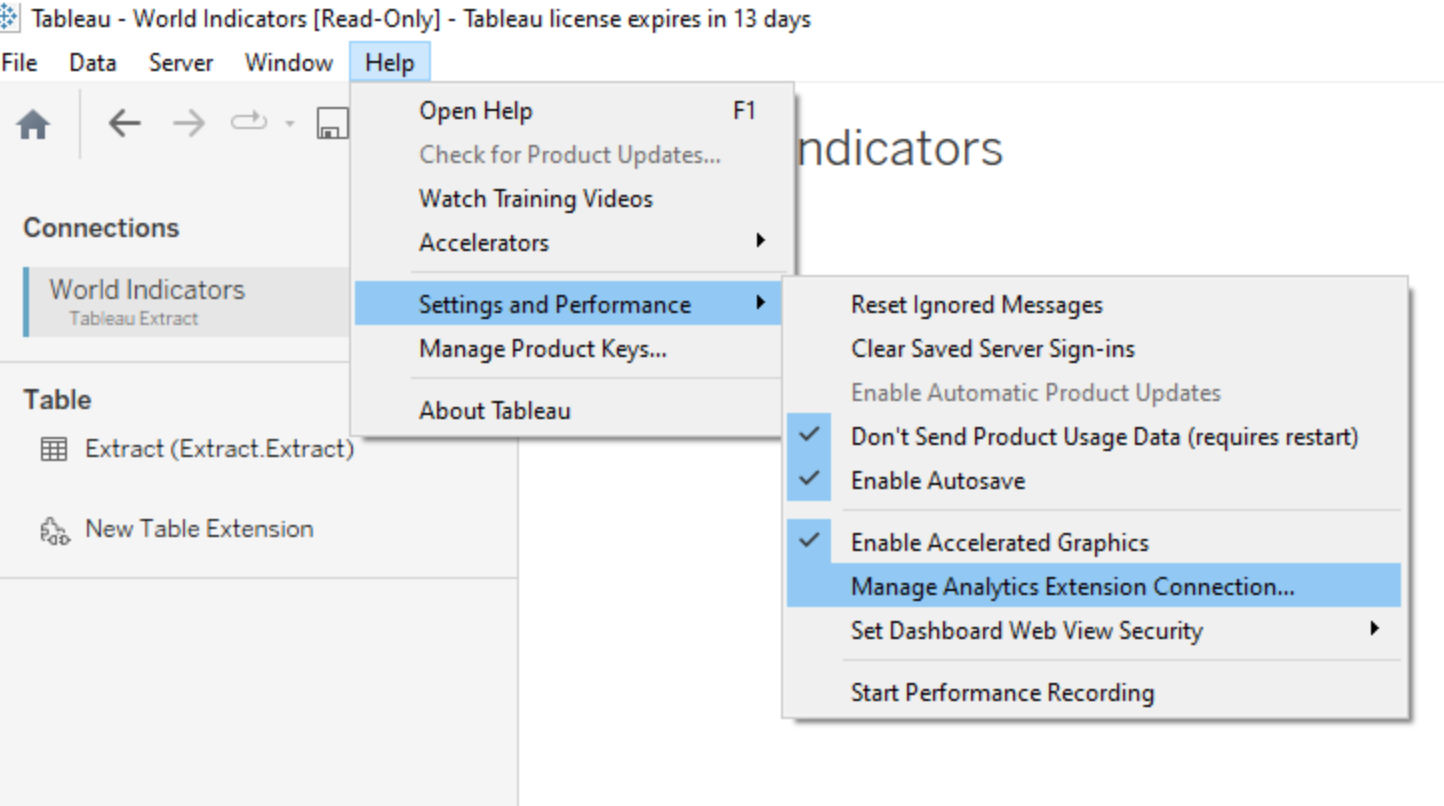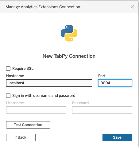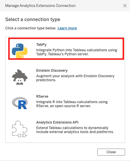 In Tableau, we can configure this from the same dialog we used for Rserve, except we’ll choose the TabPy option